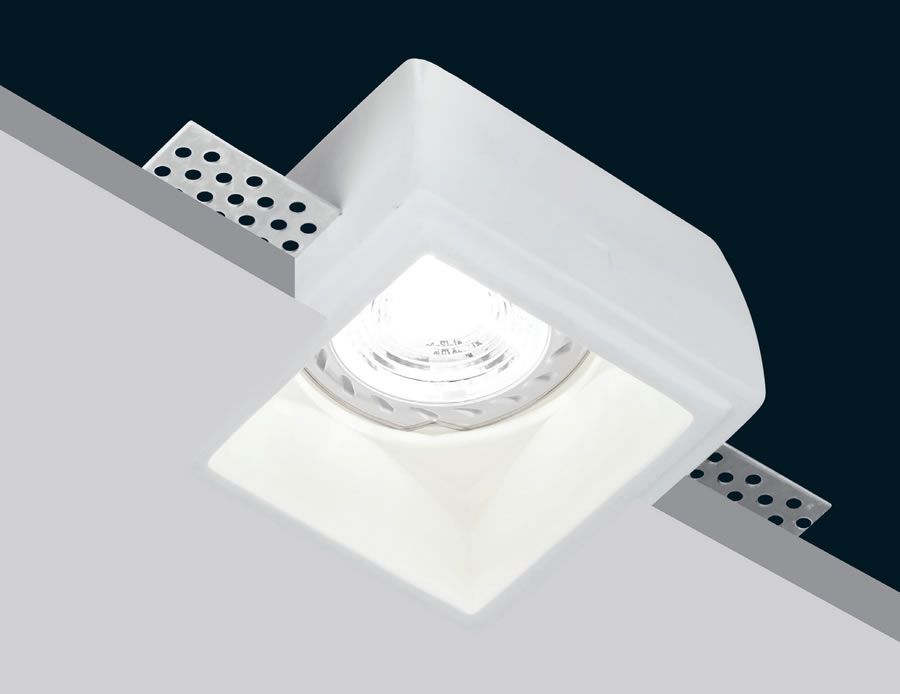 Foco de yeso para empotrar en el techo de forma cuadrada y un elemento. Fabricado en aleación especial de escayola que le permite perdurar en el tiempo sin estropearse.