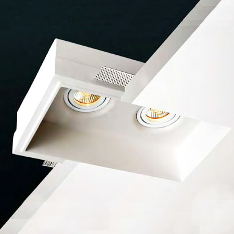 Foco de yeso para empotrar en el techo de forma rectangular y dos focos. Fabricado en aleación especial de escayola que le permite perdurar en el tiempo sin estropearse.